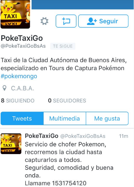 La cuenta de Twitter de Juan Pablo es @PokeTaxiGoBsAs. El tuit en el que ofreció el servicio ya tiene más de 500 retuits y 300 likes. "Servicio de chofer Pokemon, recorremos la ciudad hasta capturarlos a todos. Seguridad, comodidad y buena onda", dice el tuit.