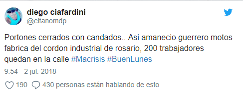 Guerrero Motos cerró hoy sin previo aviso y pese a haber firmado la paritaria. Los doscientos trabajadores de la fábrica de motos ubicada en San Lorenzo, provincia de Santa Fe; temen por su fuente laboral. La empresa había acordado el viernes y, en un mar de rumores, este lunes amaneció con sus puertas cerradas. Tensión en el cordón industrial.