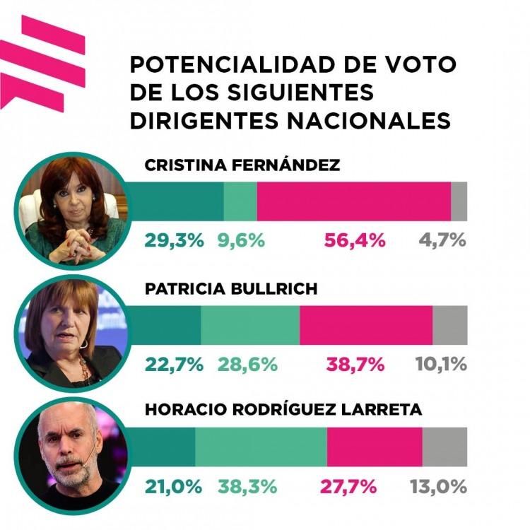 Detrás de la vicepresidenta se posicionan la titular del PRO, Patricia Bullrich con el 22,7% de voto seguro, seguida bien de cerca por su contrincante en la interna, el jefe de Gobierno porteño, Horacio Rodríguez Larreta que posee el 21% de votos seguros.