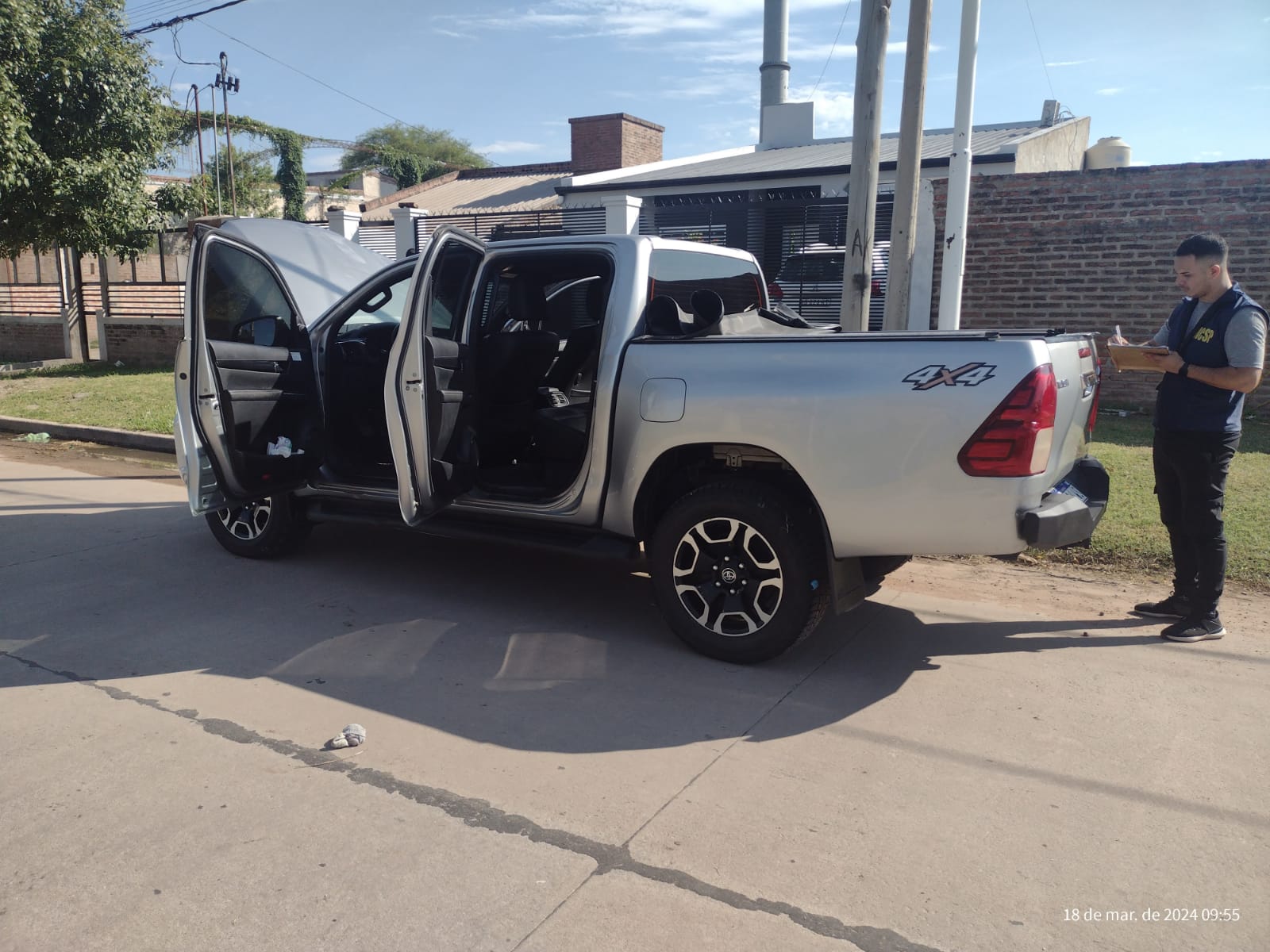 Fue a las 09.50 horas cuando desde calle 15 entre 000 y 0000 del Barrio Reserva Este procedieron al secuestro de dos camionetas que estaban en la vía pública. Una marca Chevrolet, modelo Silverado, dominio DPC 894, doble fondo y otra marca Toyota Hilux, cabina doble, dominio AD 996 WS, todo ello en el marco de la causa por infracción al Artículo 303°, 304° y 210° CPA (Lavado de activos y Asociación Ilícita).
